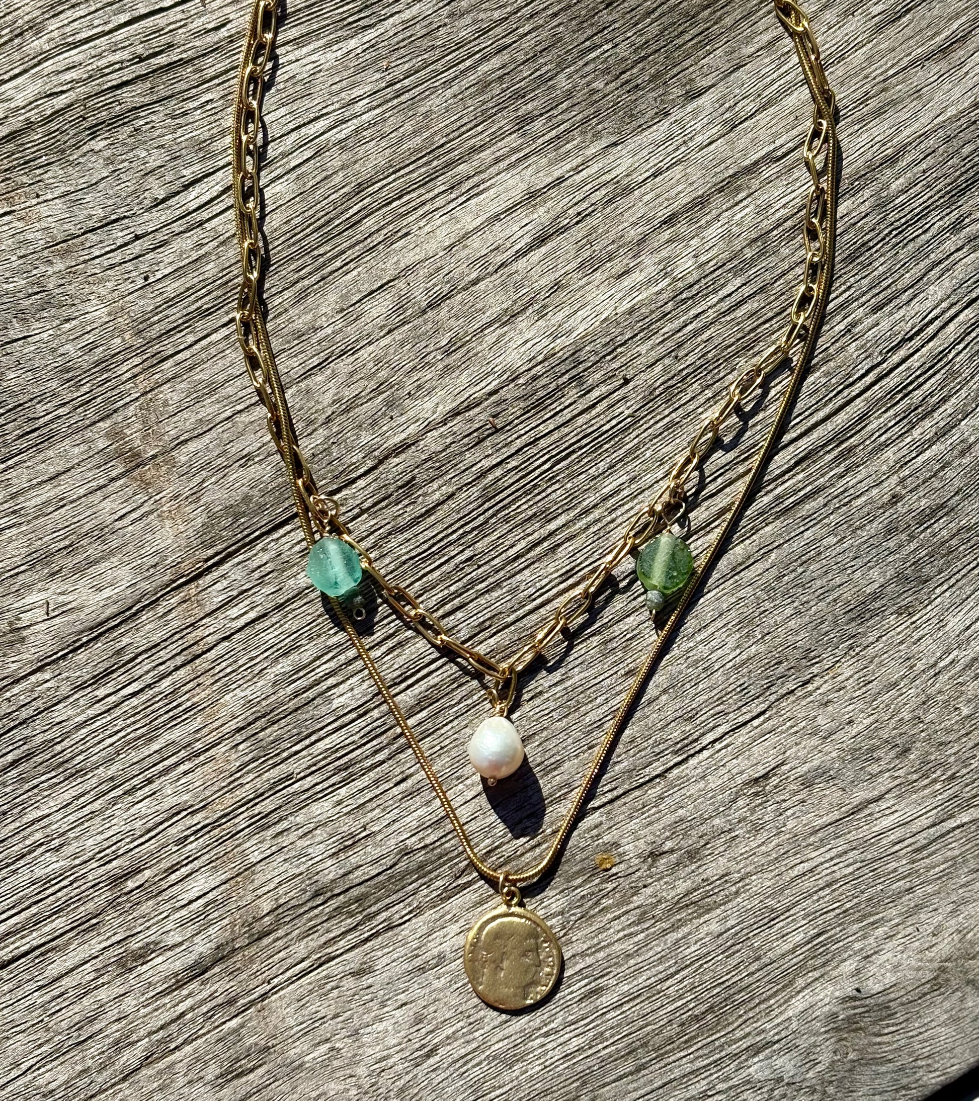 2 Layered gold filled Roman glass, vermeil coin and baroque pearl necklaces